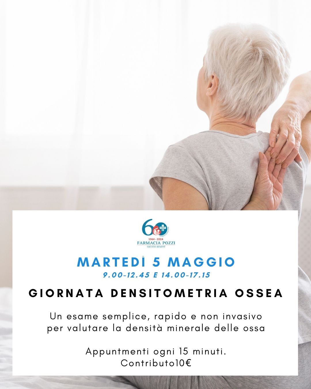 Martedì 5 maggio la farmacia ospita una giornata dedicata alla densitometria ossea, un esame semplice, rapido e non invasivo che permette di valutare la densità minerale delle ossa.